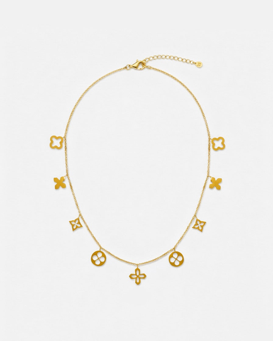 Die Halskette aus unserer Giulia Kollektion hebt sich hervor durch ihr besonderes Design. Die Kette ist mit neun filigranen Anhängern besetzt, sie spiegelt deinen Look stilsicher wieder, ein echter Hingucker.